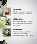 Top Notes: Pistachio, Ice cream, Bergamot, Hazelnut, Rum and Cardamom