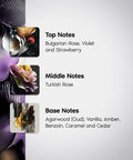 Base Notes: Agarwood (Oud), Vanilla, Amber, Benzoin, Caramel and Cedar